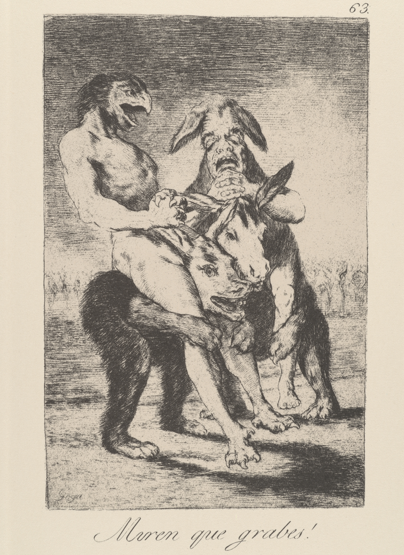 Goyas Grafik Nr.63, „Miren que grabes!/Seht wie würdevoll“, wird sowohl im Beiheft3 als auch im Katalog zur Ausstellung4 wiedergegeben, deshalb ein paar kurze Bemerkungen dazu.